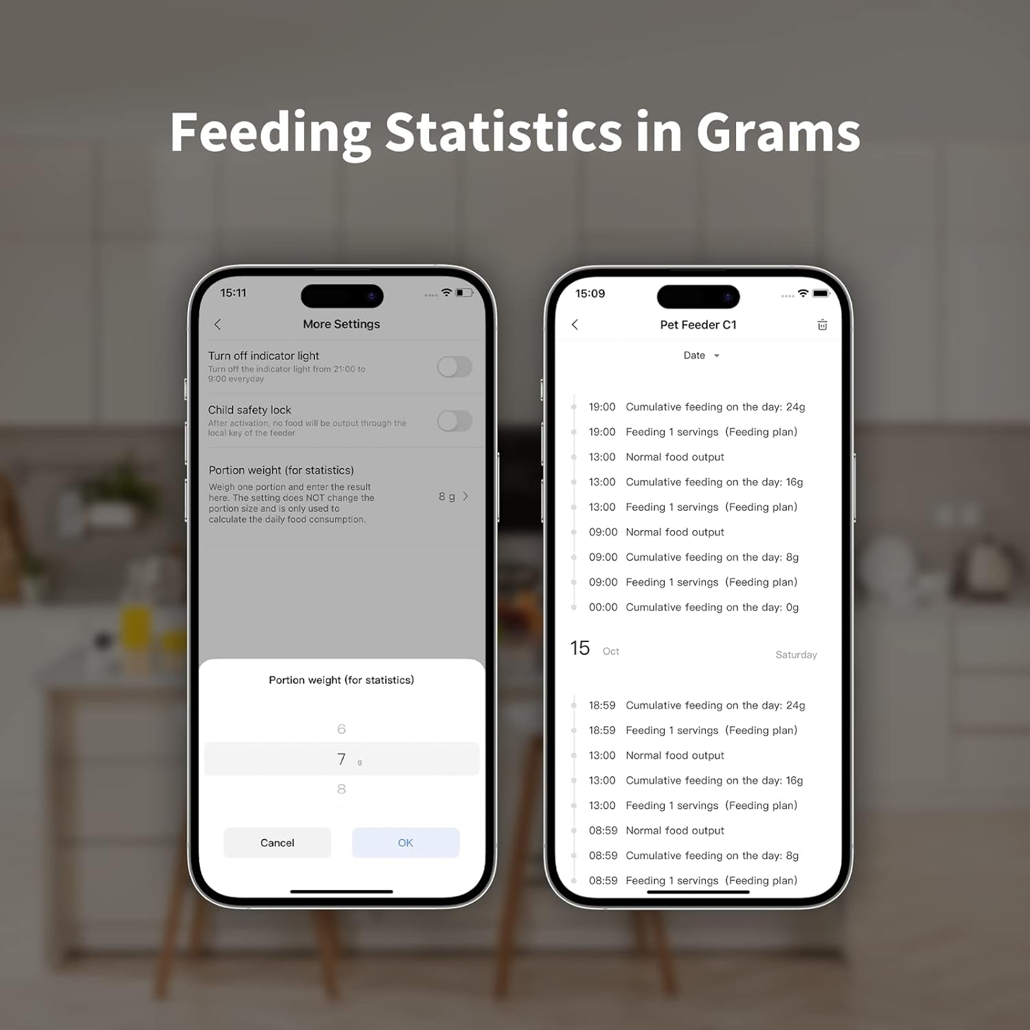 Just dispense one portion and weigh it using a kitchen scale, input the number to the device settings, then you will be able to see daily feeding statistics in the device logs.