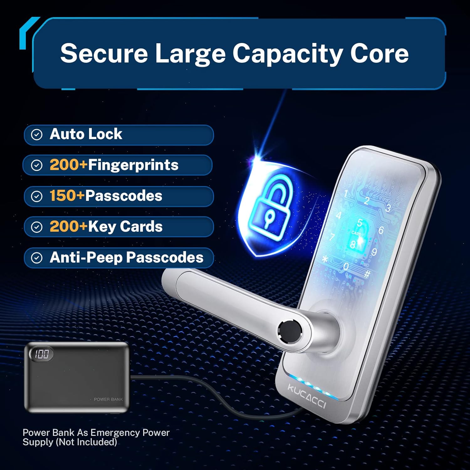 KUCACCI smart lock has a simplified appearance design, zinc alloy meterial for durability and convenient Bluetooth App management system. Upgraded fingerprint reader for more accurate identification and longer life. Hold the handle and press fingerprint to unlock in one step.