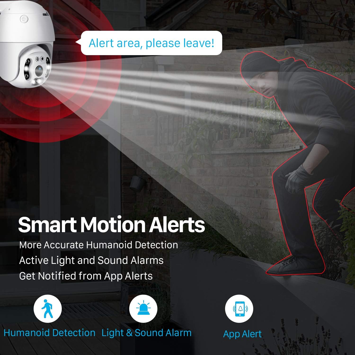 【Motion Detection & Alarms】 Want to warn uninvited guests? This outdoor security camera support customizable motion detection& remote viewing(iOS & Android), real-time and accurate movement alert with snapshot will be pushed to your phone, email & ftp server when motion detection is triggered. What’s more, this camera will send double light vigilance & sound alarms when motion objects were detected.