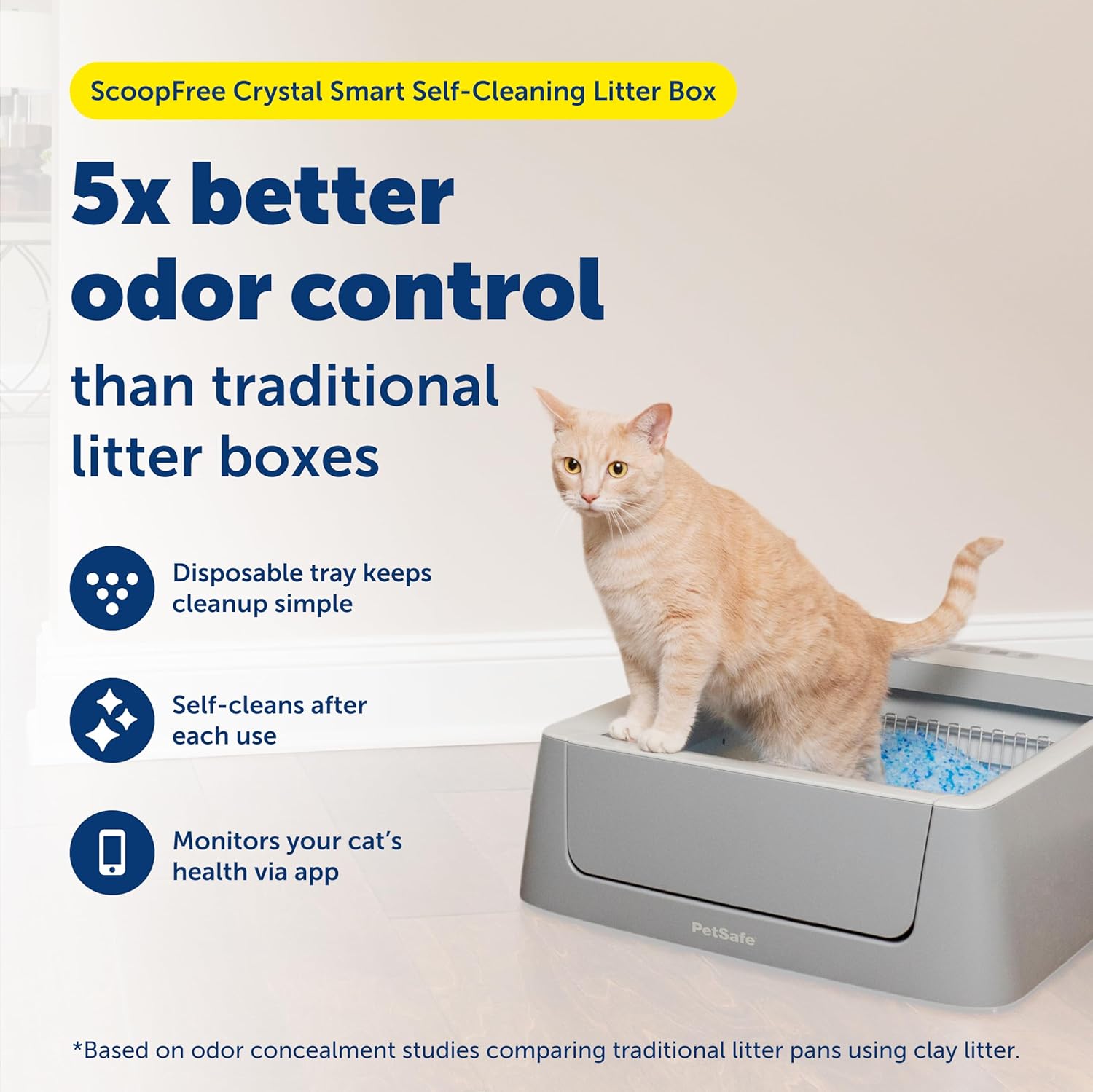 The PetSafe ScoopFree Crystal Self-Cleaning Automatic Litter Box offers a hands-free, odor-free solution for maintaining a clean and healthy environment for your indoor cat. This electric, motion-sensing cat box uses advanced self-cleaning technology to automatically rake waste into a covered compartment once your cat leaves, eliminating the need for daily scooping. This top-entry box uses non-clumping crystal litter that absorbs liquid, dehydrates solid waste, and neutralizes odors up to five times more effectively than traditional clumping litter. With low-tracking, 99% dust-free crystals and leak-proof plastic liners, this system keeps your floors stain-free and your home fresh. Tray replacement is simple: just slide out the used tray and dispose of it with the included lid for quick, hygienic cleanups with minimal effort. An integrated health counter tracks your cat’s litter box usage, helping you monitor their well-being and detect potential issues early, while the crystal litter is gentle on their paws. Whether you’re a busy pet parent or simply looking for a more efficient way to manage your cat’s litter, the PetSafe ScoopFree Crystal Pro delivers a streamlined, easy-to-use experience that keeps your cat comfortable and your home odor free. Since 1988, PetSafe has been driven by a simple belief: safe, healthy pets lead to happier lives for pets and their families. For over 25 years, we’ve been dedicated to enhancing the lives of pets and the people who love them, treating every pet as a cherished family member and delivering life-changing innovations designed to enrich every moment. With U.S. roots and a global reach, our vet- and trainer-recommended products are built for every pet and backed by exceptional customer support. From backyards to dog parks, we’re on a mission to create fields of joy for happy, healthy, and safe pets.