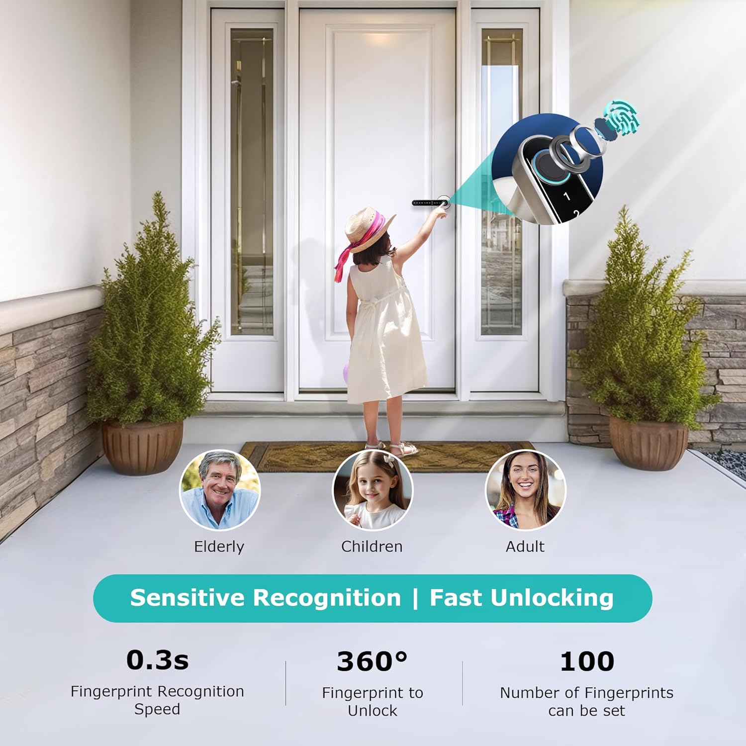đăAdvanced 5-in-1 Keyless Entry Door LockăUnlock with fingerprint recognition,anti-peep virtual password,smartphone access,IC card (5 included),and physical keys (2 included).One-Touch Fingerprint Access reads your fingerprint instantly for seamless entry.