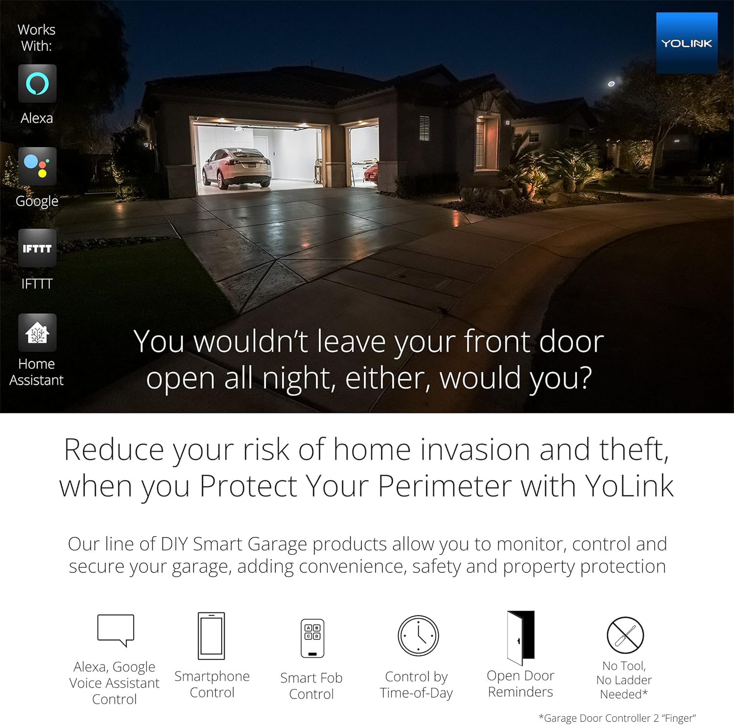 PROTECT YOUR PERIMETER! You are at risk of intrusion through your garage door, especially if your vehicles with garage door buttons are parked outside! The YoLink Garage Door Sensor allows you to monitor the status of your garage door, from anywhere at any time. You can “arm” the door on a schedule or as part of a scene or on-demand, to protect you and your family while you sleep.